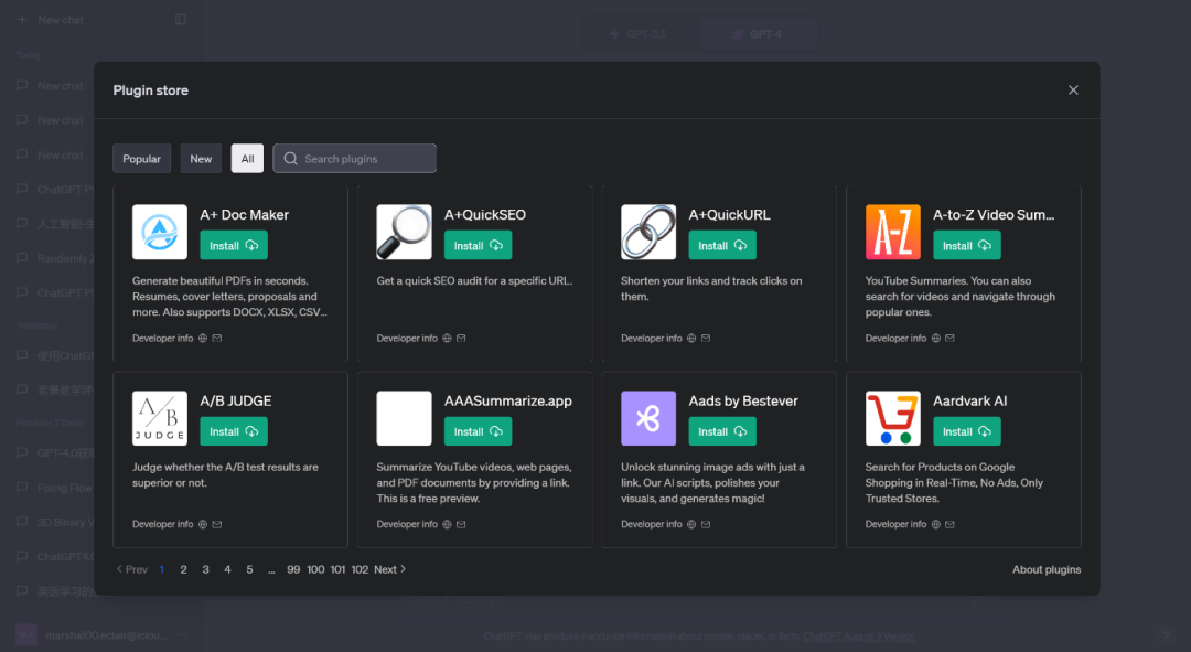- GPT-4.0每三小时可以提问50次,并且可以调用插件。