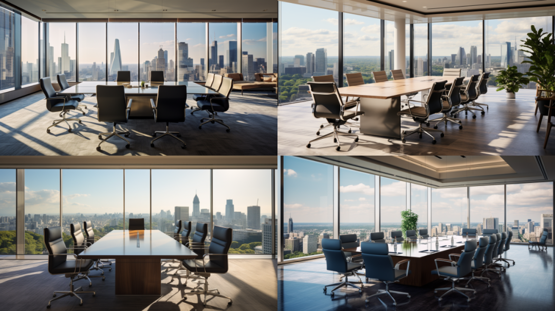 /imageprompt: Photography by an architecture firm, a panoramic view of a conference room in a Class A office building, with versatile chairs arranged around a large table, captured with natural lighting to showcase the chairs' elegant design and practical features, luxurious and professional background with a panoramic city view, emphasizing the office's status and sophistication, refined and practical style, 4k, photorealistic, ultra detailed -- ar 16:9.