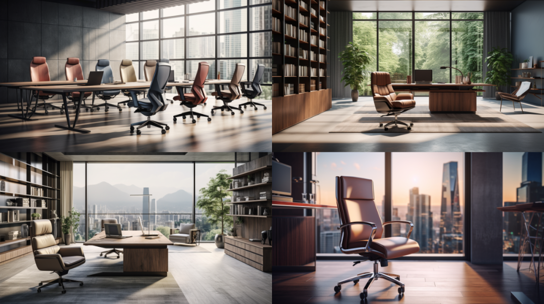 /imageprompt: Photography by a furniture brand, a panoramic view of an office with a versatile chair next to a desk, captured with natural lighting to highlight the chair's ergonomic features and sleek design, sophisticated and professional background with muted colors and clean lines, functional and comfortable style, 4k, photorealistic, ultradetailed -- ar 16:9.