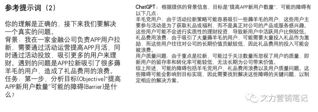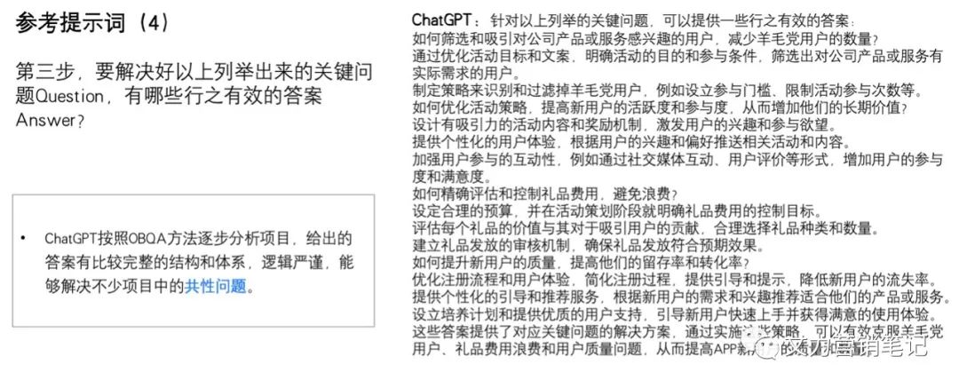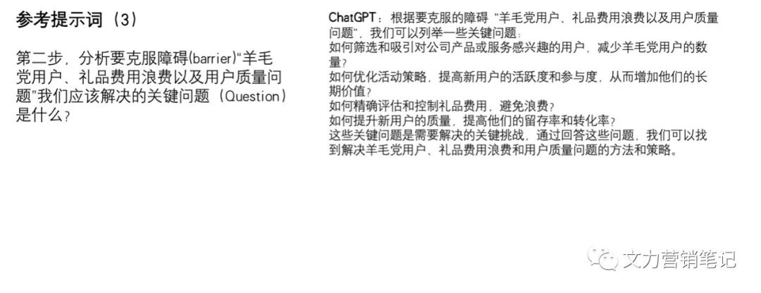 第三段提示词。第二步,分析要克服障碍“羊毛党用户、礼品费用浪费以及用户质量问题”我们应该解决的关键问题是什么?