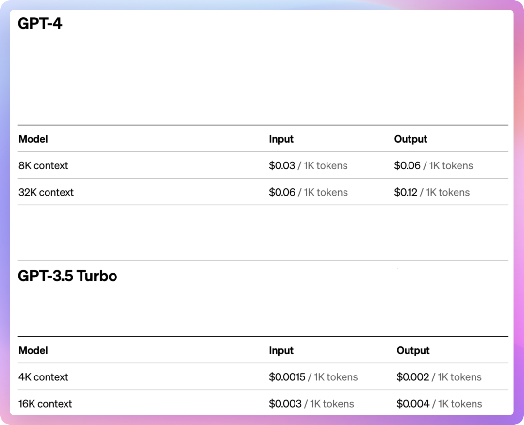 ChatGPT 不仅会统计自己输出了多少内容,还会记录用户输入了多少内容,毕竟它也需要先分析输入的文本才能输出有意义的回答,统一换算为 Tokens 值后汇总费用。以下是 ChatGPT API 的官方收费表,里面的 4K、8K 等数据代表单次问答中的最大上下文 Tokens 值。