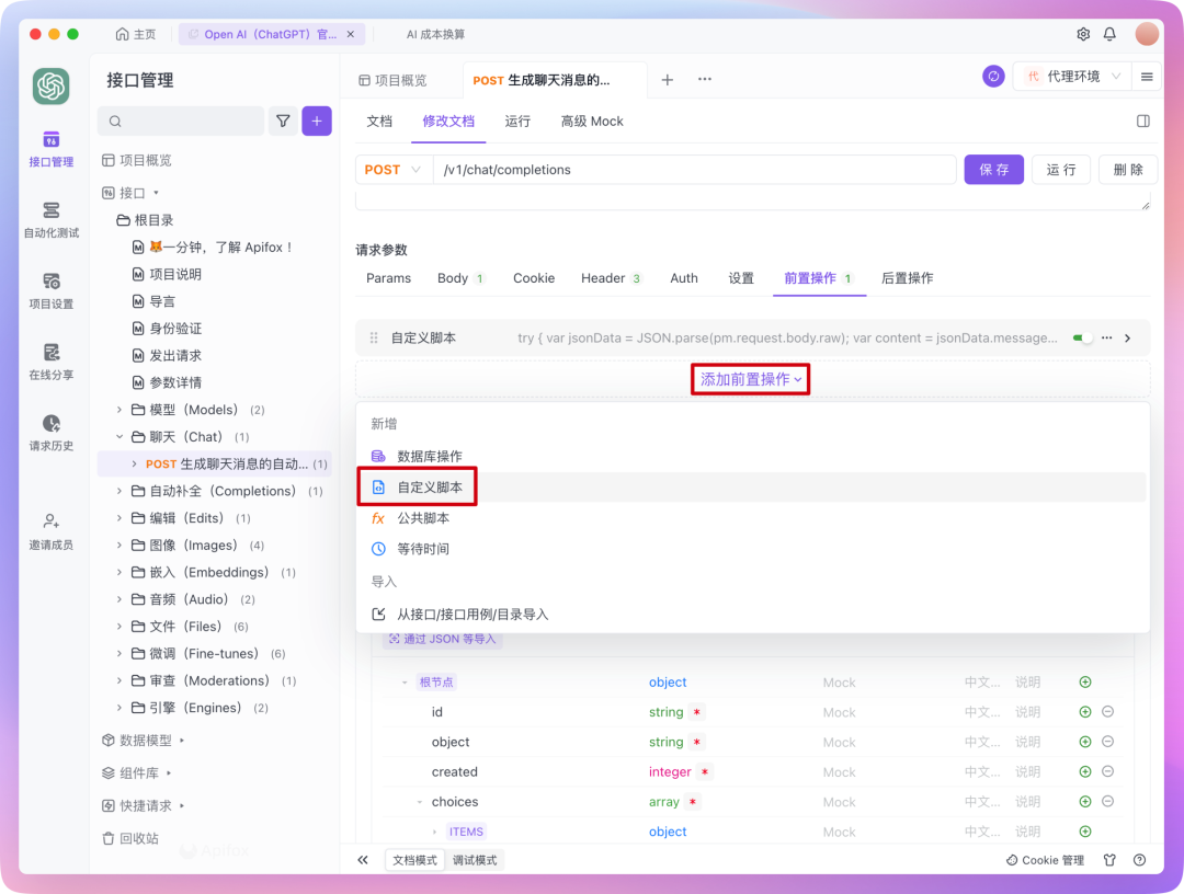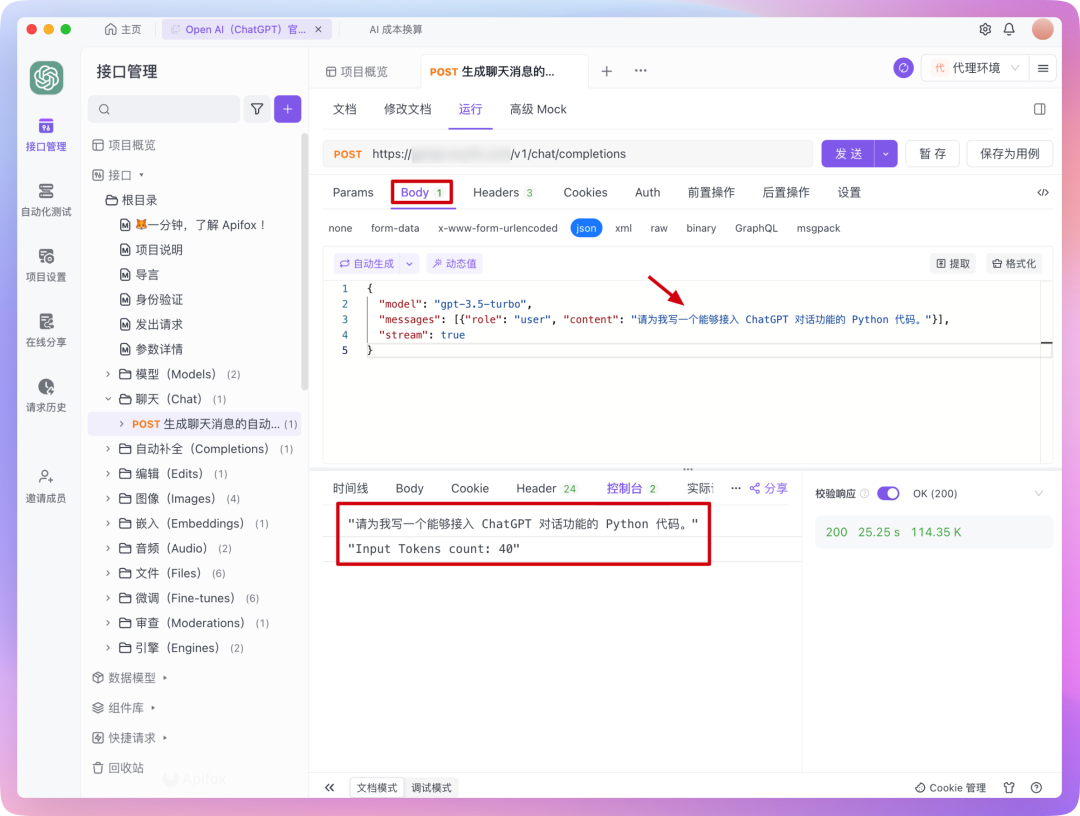 输入值就是在询问 ChatGPT 时所填写的问题。你可以在 “聊天消息” API 文档的前置操作中添加一个自定义脚本,使得 Apifox 能够调用上文中写好的 Tokens 换算脚本,提取位于请求参数 Body 中的 content 参数后换算为 Tokens 值。