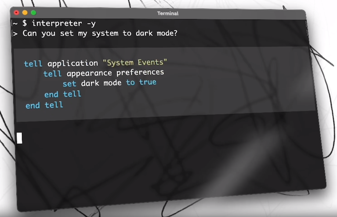 比如在终端输入:能否把操作系统设置成夜间模式?解释器输出一段代码后,执行成功就能将操作系统设置为夜间模式。