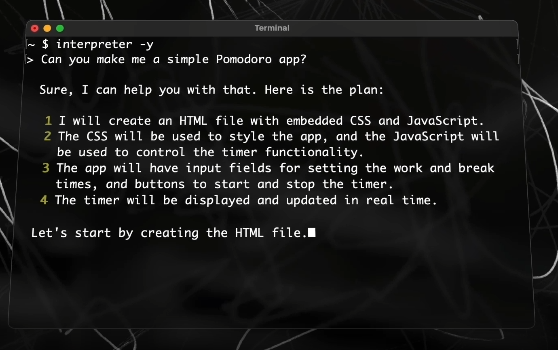 比如在终端输入:能否做一个简单的番茄钟APP?解释器输出一个计划后,创建了 HTML 代码供你参考。