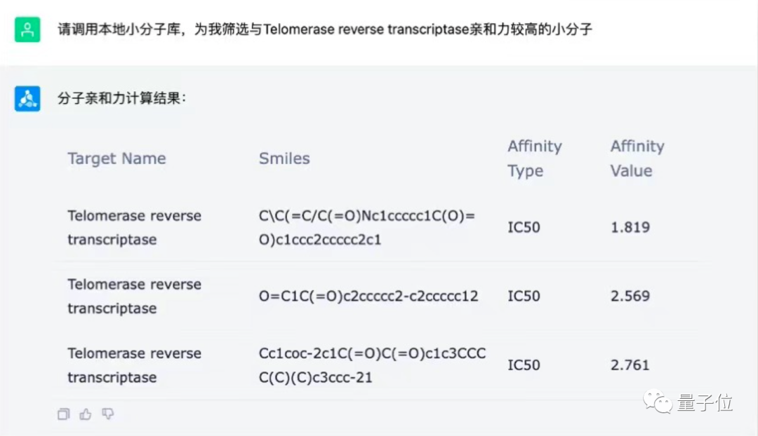 试试更复杂一点的任务,例如计算亲和力问题,大模型竟然直接“推荐”了一个工具,并快速计算出结果: