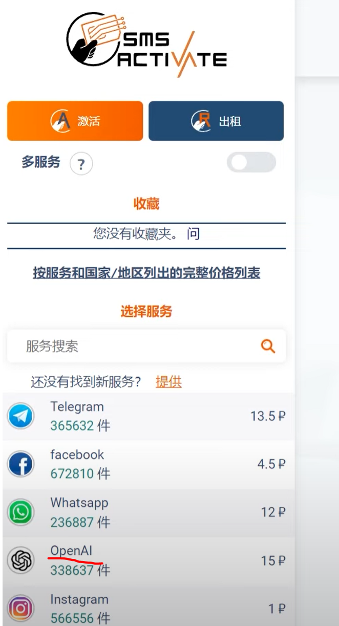 -然后需要外国手机号和验证码,可以花2美元在这个网站上注册之后充值,然后找OpenAI的选一个国家的号码。