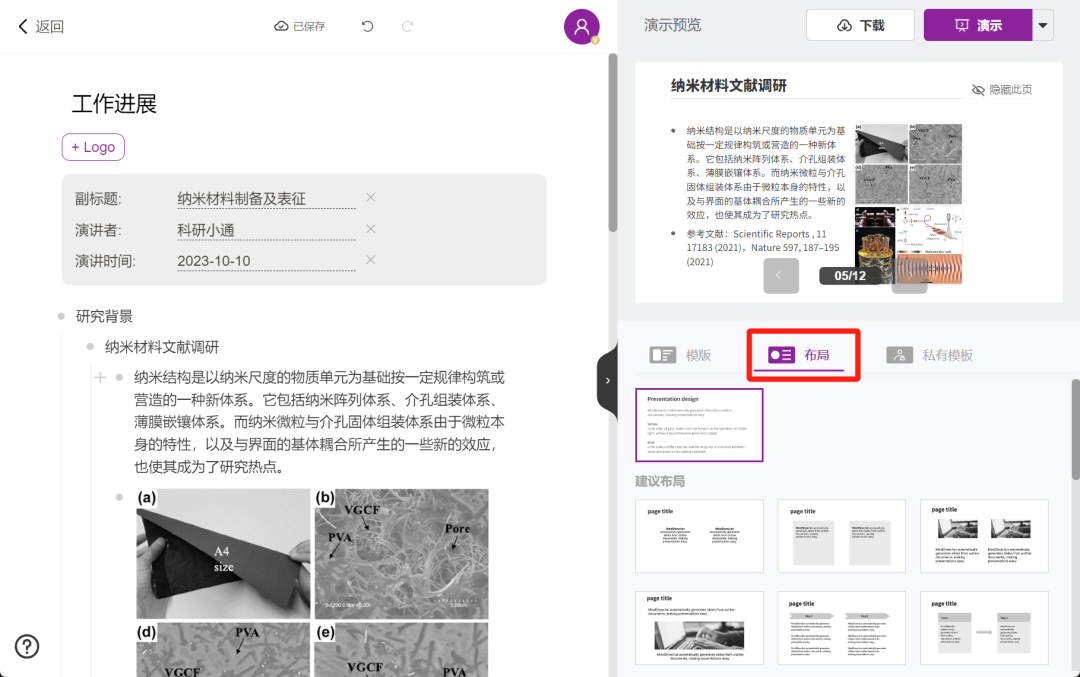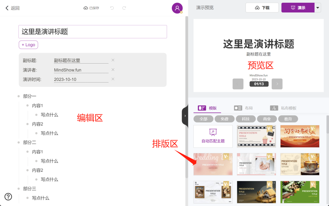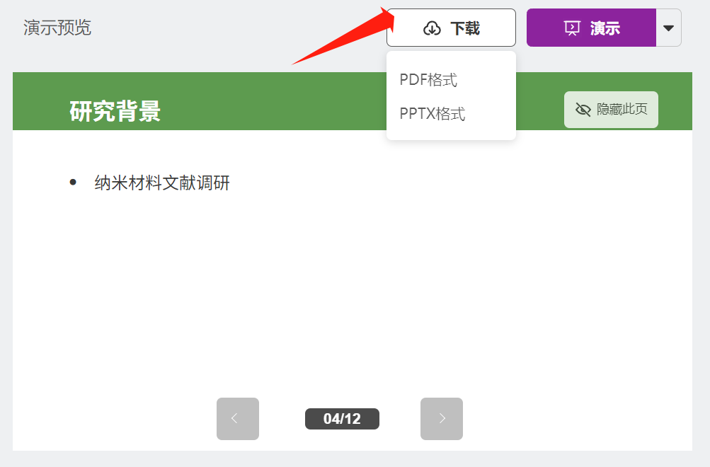 编辑完成后,点击下载。 可以下载PDF格式和PPTX格式(需要VIP)。 或者点击演示,直接进行播放。 ![]()