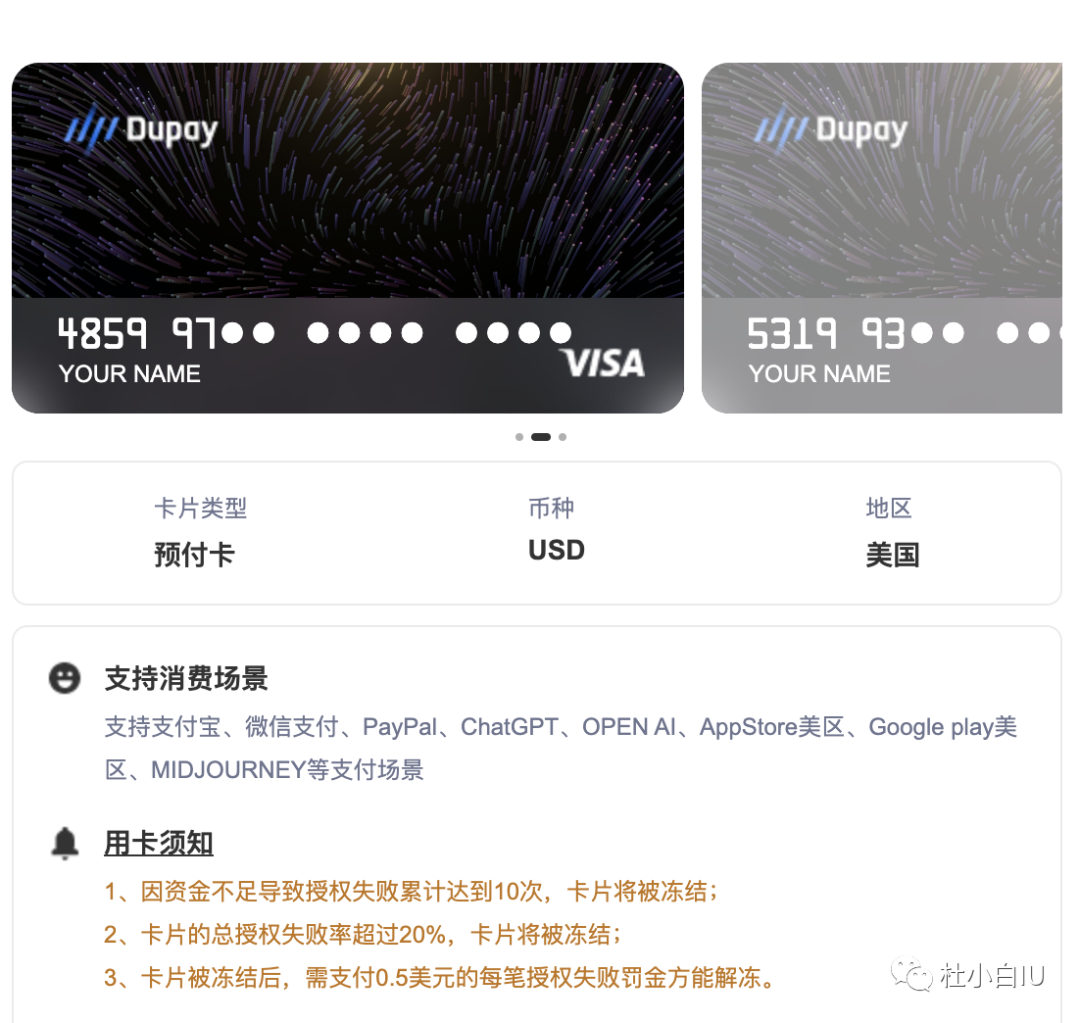这个的话是相对来说比较靠谱和简单的方式了。开卡,充值,支付即可。不过虚拟信用卡的话是比较杂乱,这里可以列举几个运营商:Fotoncard、nobepay、Dupay、Onekey。不过使用虚拟信用卡,可能有开卡费、月费/年费、手续费、不同卡种等地方需要注意以及其他的一些卡片使用要求。这里我随便选了一个运营商Dupay举个🌰: