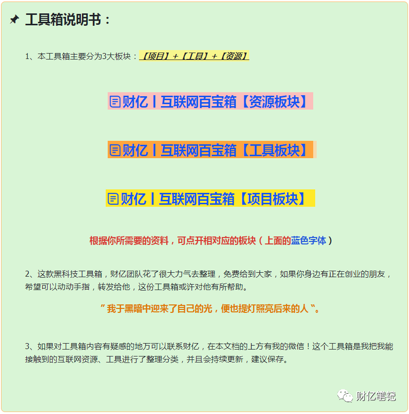 我整理了一个互联网黑科技工具箱,包含项目、资源、工具三大板块,如有需要可以添加微信“备注”工具箱,免费领取。