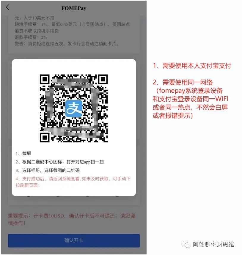 点击确认开卡后,把出现的支付宝二维码截图,然后打开自己的支付宝扫码支付即可。
