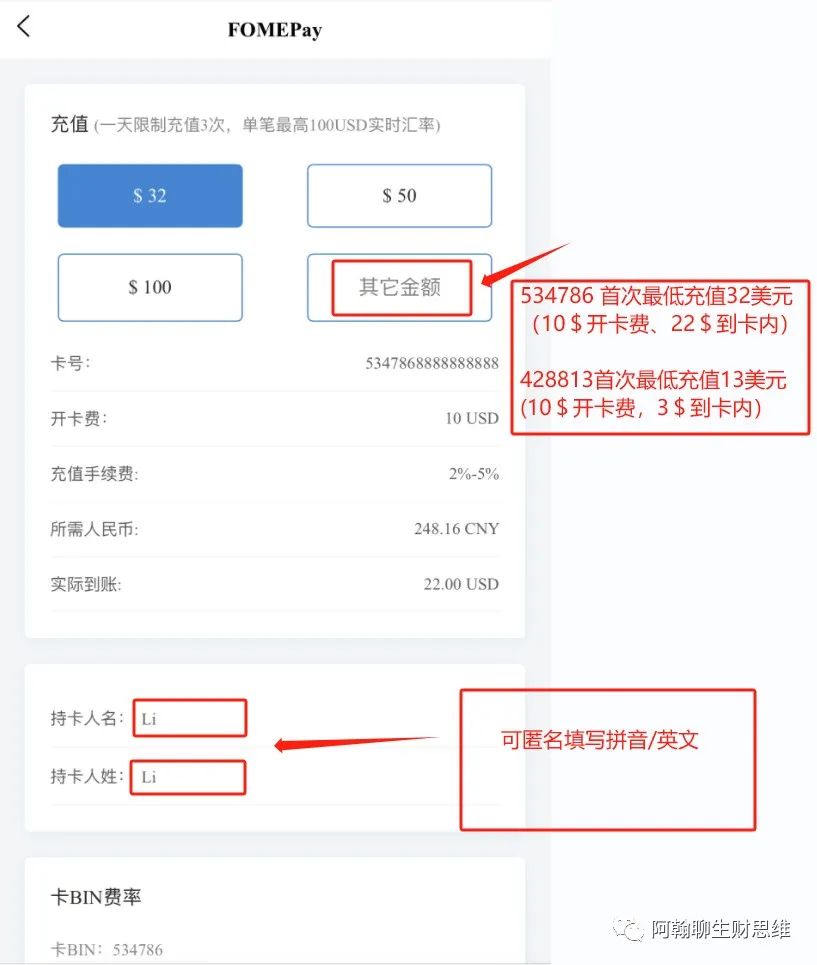 这个卡段,上面也说明了,首次开卡建议直接选择默认的32美金即可,10美金开卡费,22美金卡内余额。