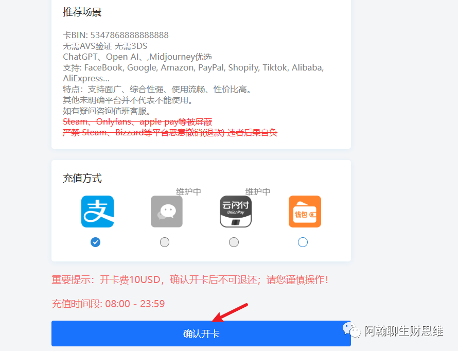 然后选择默认的支付宝充值方式,之后点击确认开卡即可。