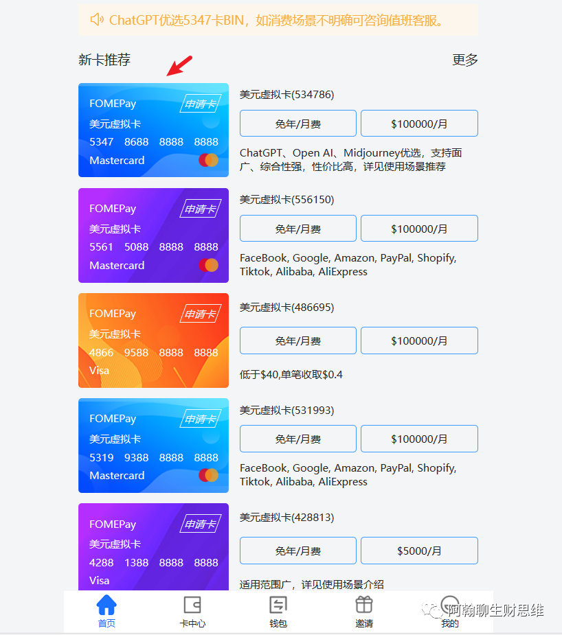 登录进去之后,这里面可以看到很多卡。如果你只是想充值ChatGPT,Midjourney,Claude 2的话。选择第一个534786卡段的卡即可。