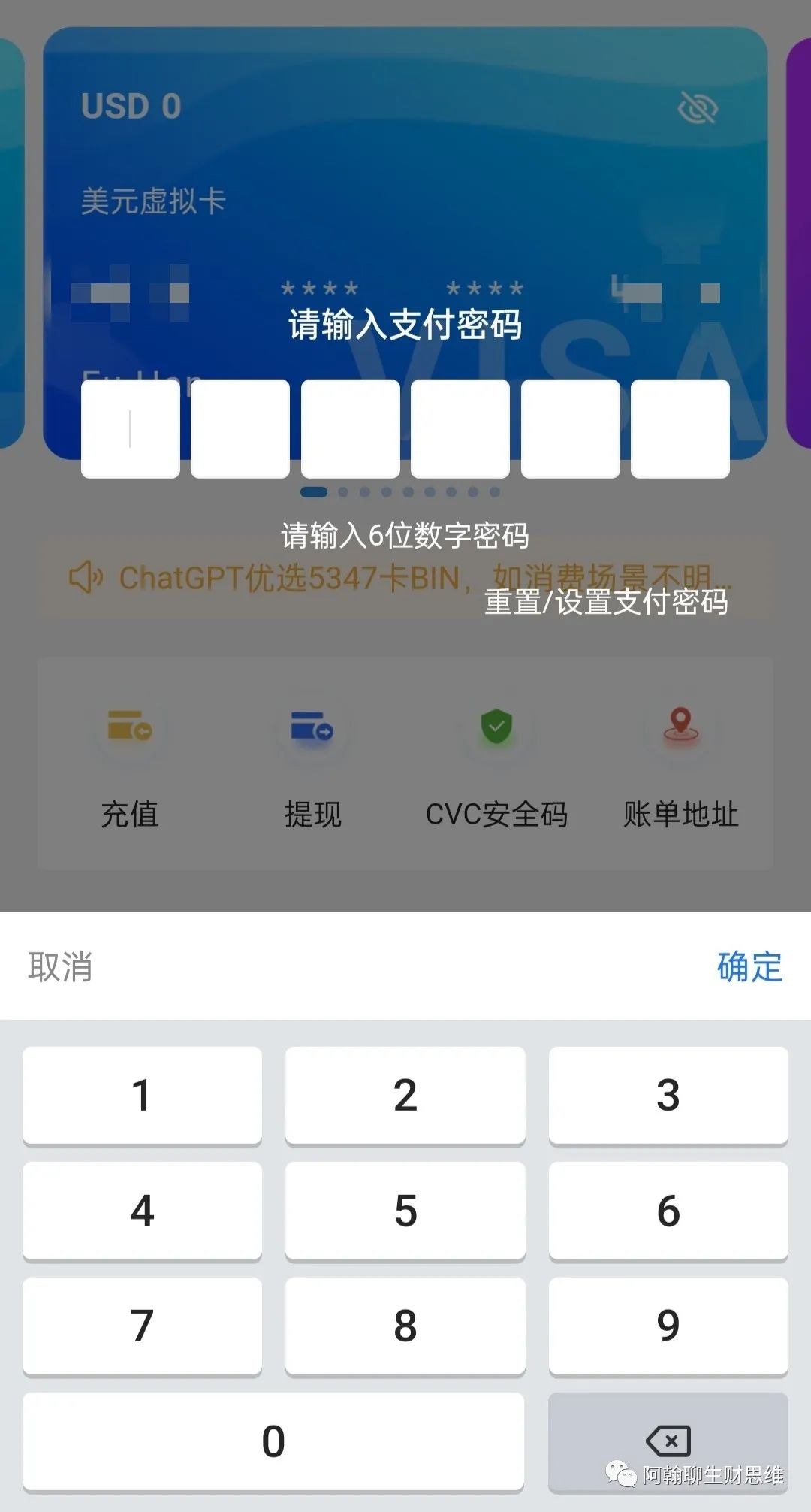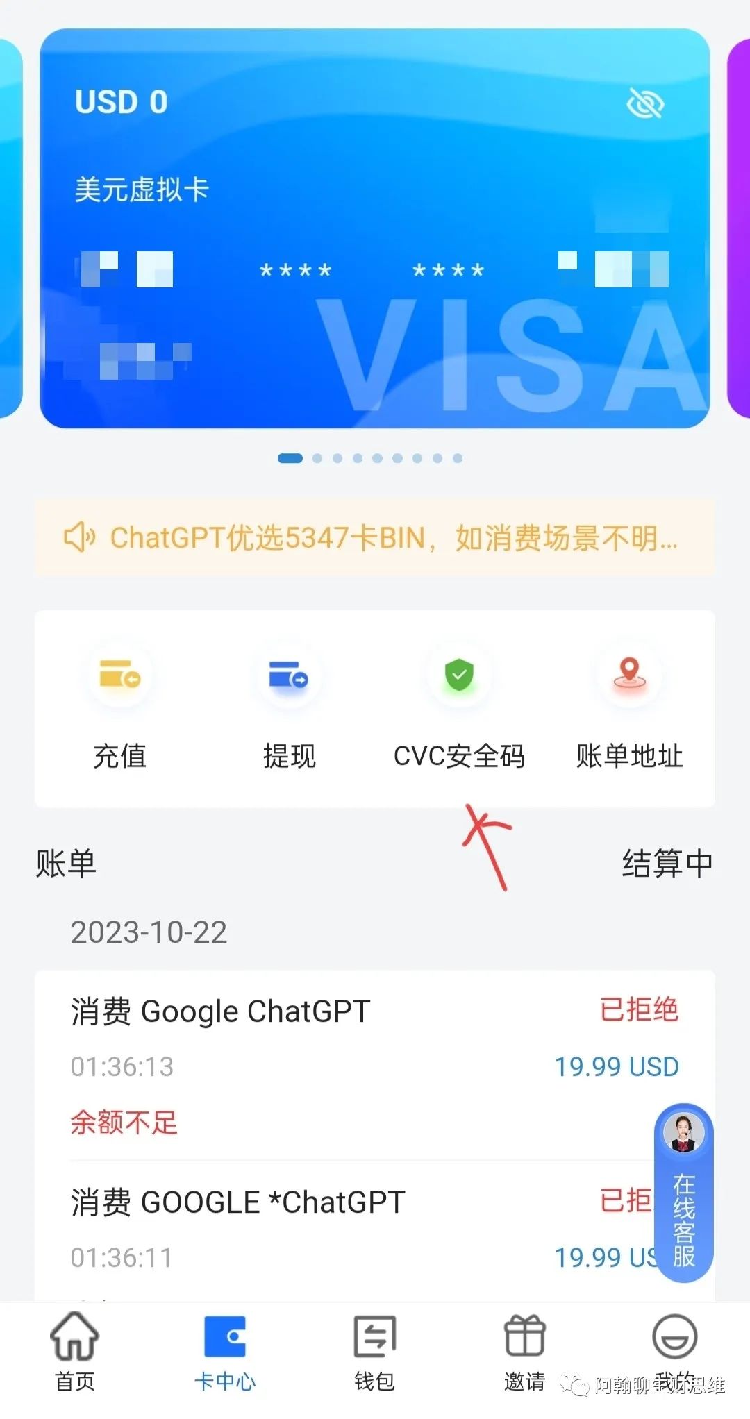 点击左下方的卡中心,会看到你开卡的相关信息。最上方会出现余额,卡的账号。
