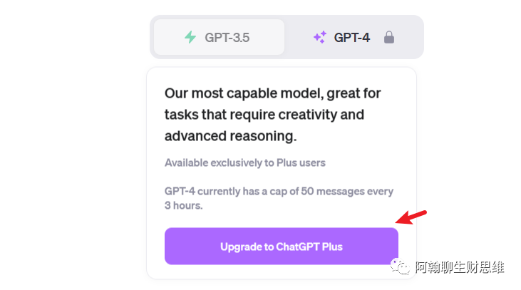 点击上方的GPT-4,上方是出现锁的状况,代表你没有开通plus会员。点击下方的Upgrade to ChatGPT Plus