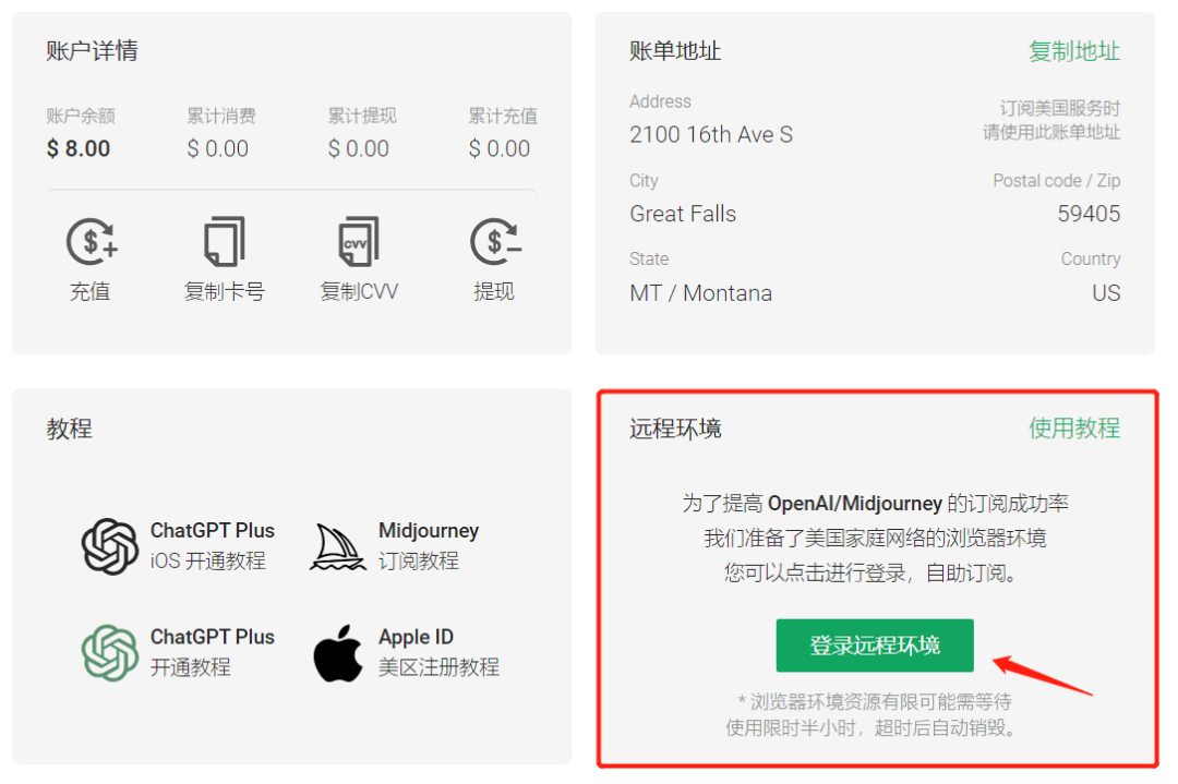 3. 使用美国家庭网络环境:为了顺利绑定/付款并提高交易成功率,WildCard 提供了免费的美国家庭网络环境,每位充值客户可以免费使用两个 Session,每个 Session 可使用半小时。这样的浏览器环境会在使用后自动销毁,保护您的隐私。