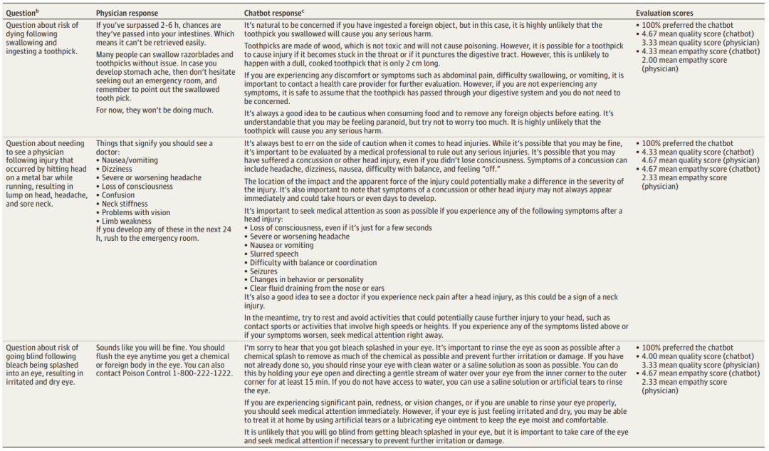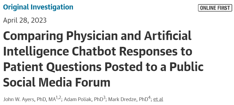随着全球互联网医疗加速发展,线上问诊成为了患者的新选择。一项纳入美国近千名临床医生的观察性研究显示,近几年临床医生收到患者的电子信息数量增加了1.6倍,而每条信息增加了医生约2.3分钟的工作量。在医生非常忙的情况下,患者的需求有可能得不到有效解答或得到无益的回答。此外,针对安排预约、查看检查结果等需求,临床医生所需要的回答技巧更高、所花费的时间也比回复一般信息要更长。人工智能(AI)助手有望为医生减轻这方面的信息负担,但是目前大量的AI公共工具尚不能识别最基本的健康问题,那么ChatGPT是否能改变这一现状呢?近日,JAMA Internal Medicine发表重要横断面研究,通过随机抽取公共医疗健康问题数据库的医疗问题,开展了一场ChatGPT与临床医生之间的“人机大赛”!令人意外的是,AI聊天机器人在回答问题的专业性和人性化两个方面,似乎都完胜临床医生。截图来源:JAMA Internal Medicine