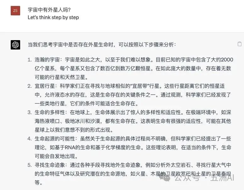 大家是否注意到了,仅仅是加上了“Let's think step by step”,ChatGPT给出的答案的逻辑性和深度都得到了大幅提升。