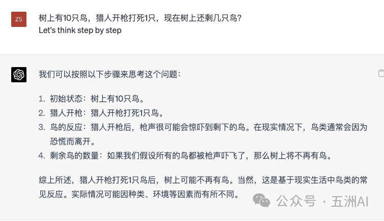 加上“Let's think step by step”之后,ChatGPT会将它的整个思考过程呈现出来。