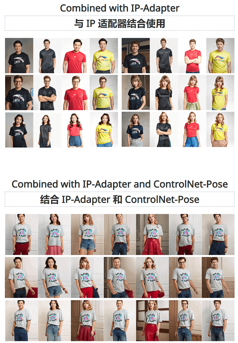 它能够结合 IP-Adapter 和 ControlNet-Pose 使用,并可以通过文本提示来支持更换不同场景。