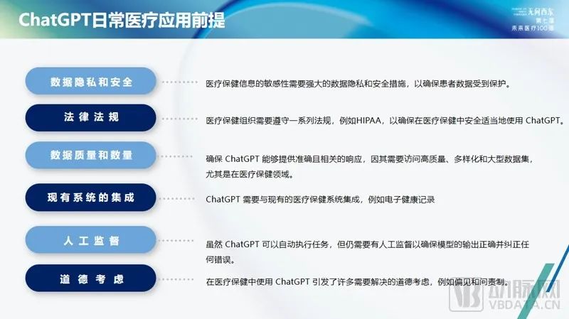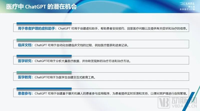 其次,生成式AI的出现,为行业带来了效率的提升。例如对患者照护,在患者康复需求的营养、运动等方面,ChatGPT可以带来一些改变。此外,这样的应用还可拓展至包括临床文档、医学研究、医学教育等诸多方面。