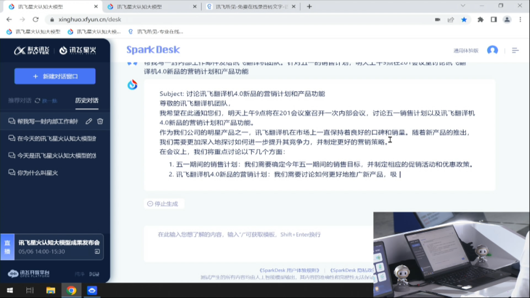 与百度不同,这次发布会进行了星火大模型的现场演示,也让观众直观的感受了其表现。