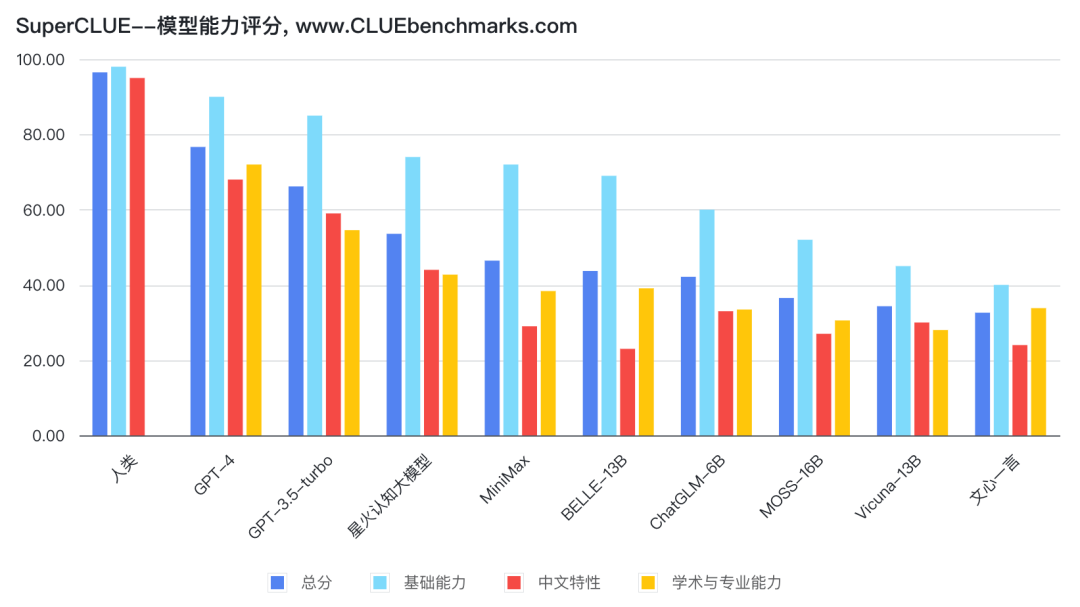 具体从评分维度上来说, SuperCLUE是从基础能力、专业能力和中文特性能力,三方面给出评价。