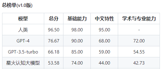 排名中,GPT-4不出意料的遥遥领先,而星火大模型次于GPT-3-turbo排名第三,另外,百度文心一言排名第九。