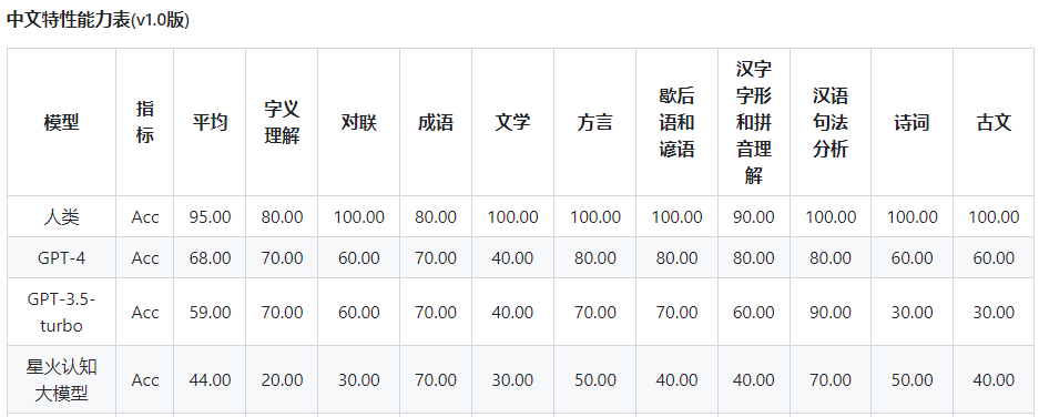 而更让人惊讶的是中文特征能力方面,星火大模型的得分远低于GPT-4,比如字义理解、对联、方言、歇后语和谚语、汉字字形和拼音理解、古文等。