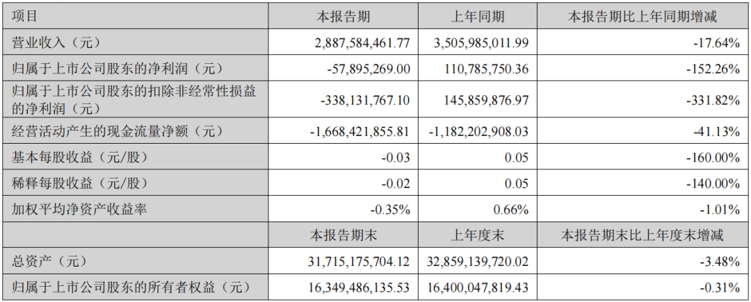 2023年第一季度,公司实现营收28.88亿元,同比下降17.64%;净亏损5789.53万元;扣非后净亏损3.38亿元。