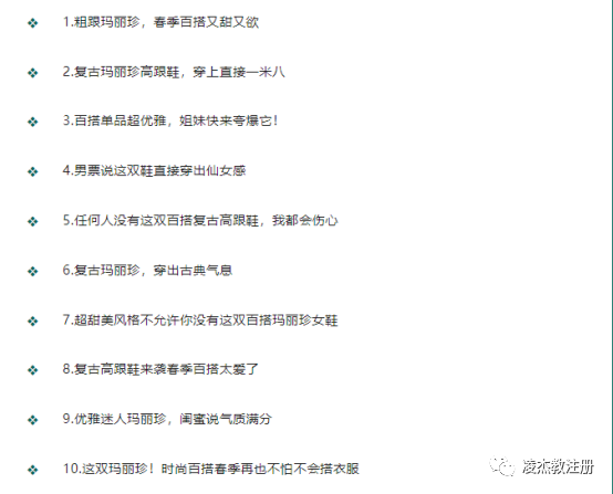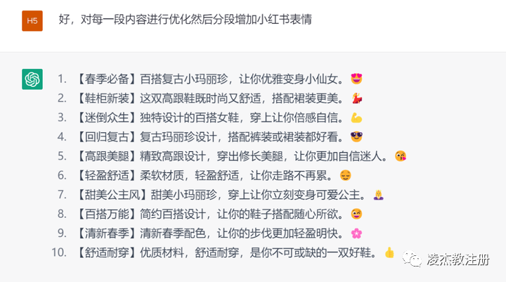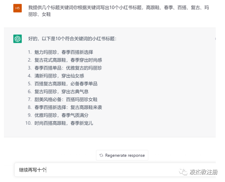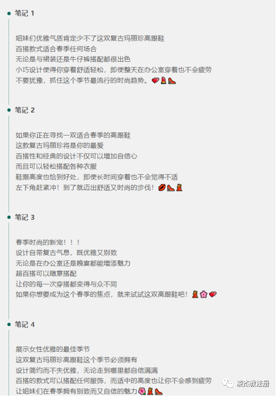 我会先提取出这款鞋子的关键词,例如:高跟鞋、春季、百搭、复古、玛丽珍、女鞋。然后,我会让AI根据这些关键词,生成一系列的标题。我可以生成10条、20条,甚至是50条,为自己提供更多的灵感。接着,让AI根据生成的标题来写内容。