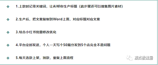 首先,上款时记录关键词,让AI帮你生产标题。其次,将生成的文案复制到Word上面,对应标题对应文案。再者,结合小红书,批量修改优化。然后,定时发布到平台,如果你能够一天写出50篇文案,那么分发到5个店铺完全不是问题。最后,每天选款上架,测款,重复上述流程。