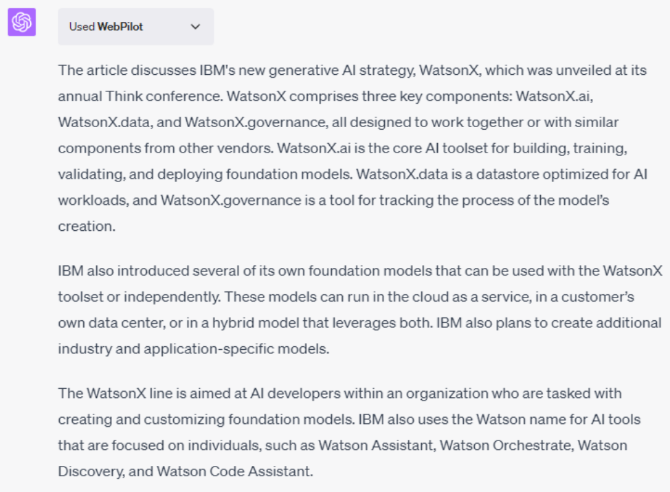 在这个示例中,用户利用ChatGPT的插件功能,首先使用了一个名为WebPilot的插件。WebPilot是一个能够帮助ChatGPT总结文章的插件。