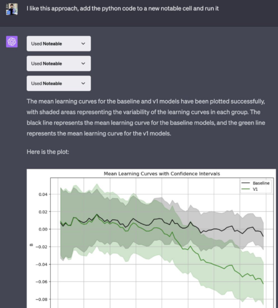 值得一提的是,GPT-4和Jupyter Notebook的结合确实可以生成图表。这使得模型训练过程中生成学习曲线置信区间的例子成为可能。