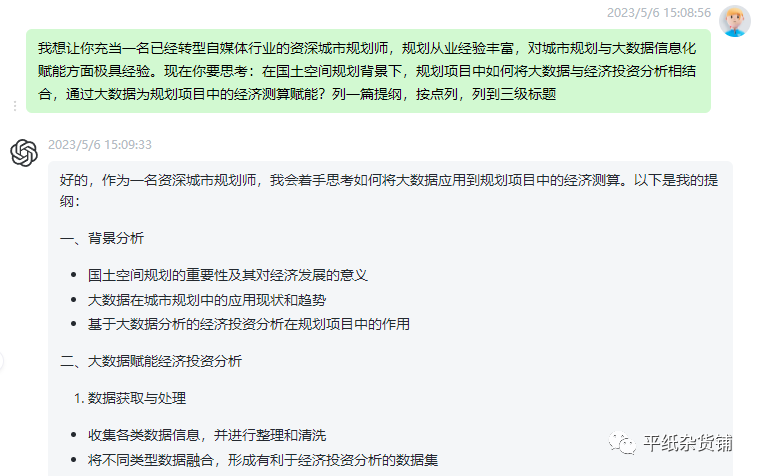 在规划编制过程中,城市规划师需要处理大量的规划文献、地图数据、统计数据等信息,而chatGPT可以通过对这些数据进行深度学习和自然语言处理,实现海量数据的快速识别和分析,从而协助城市规划师更快速、准确地掌握城市规划背景资料。