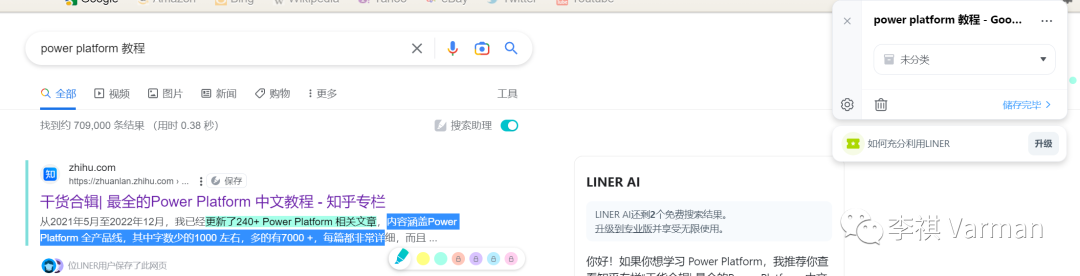 安装成功后,当我们使用 Google 搜索时,搜索结果会使用重点色进行标注,同时界面右侧会直接出现 LINER AI 的提示窗口,其中利用GPT 的能力将最符合需求的结果给到了我们。